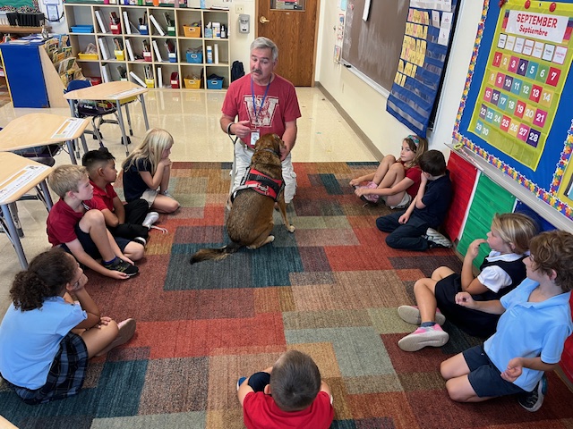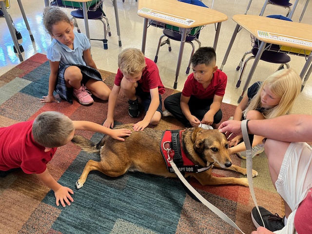 At Holy Cross, learning is about more than academics—it’s about nurturing the whole child. One of the most beloved ways we do that is through the gentle, calming presence of our therapy dogs, Sassy and Morgan, and their handlers, Paul and Sue.